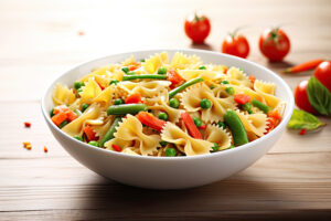Ingredientes: 225 g de pasta tipo moñito (farfalle)¾ taza de tomates cherry¾ taza de pepino inglés¾ taza de pimiento rojo¼ taza de queso parmesano rallado2